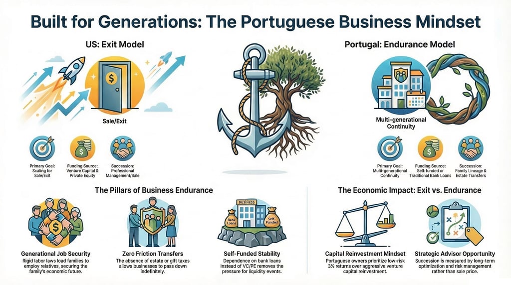 For anyone in valuation and strategy, that completely shifts the landscape. The real opportunity here isn't necessarily in plain vanilla business valuation for M&A; it's in strategic advising. While the US market is engineered to push founders toward the exit, the Portuguese market is fundamentally built for endurance. Families here hold onto businesses across generations, and when you look at the underlying data and market mechanics, there are a few very pragmatic reasons why.